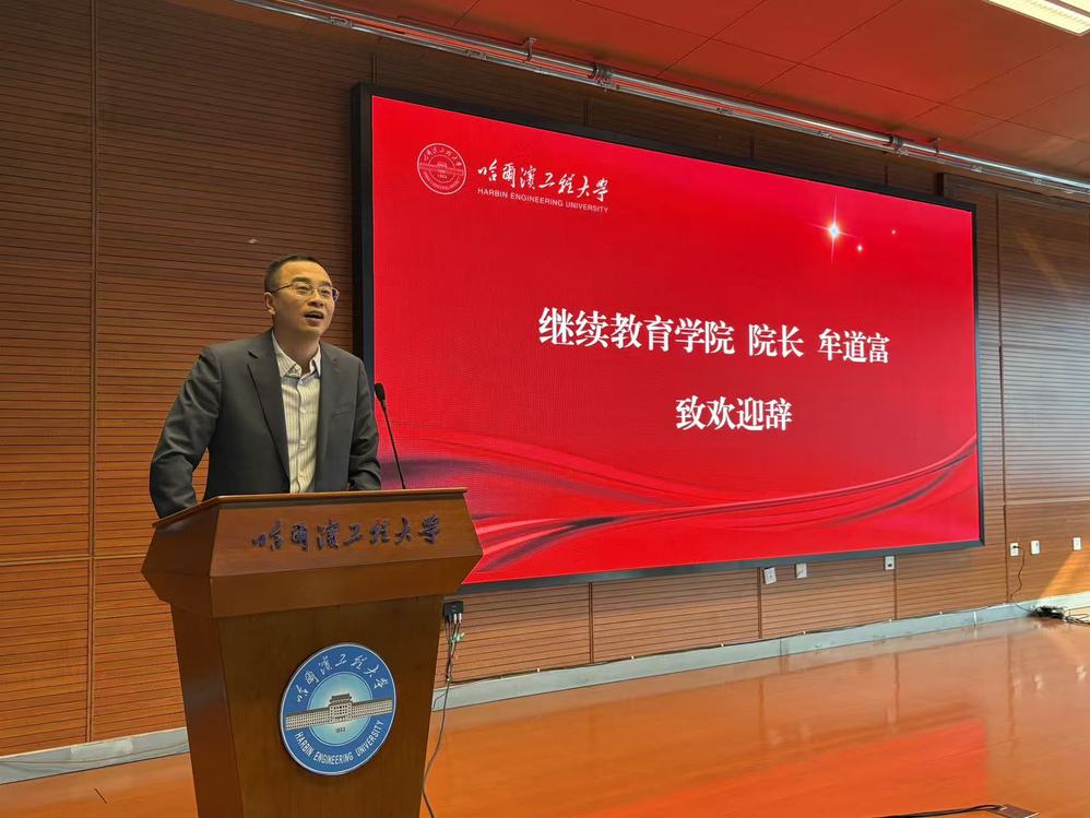 继续教育学院院长牟道富代表学院全体教职工向全体 2026 级新生致以热烈的欢迎和诚挚的祝贺。牟道富院长向新生们介绍了哈尔滨工程大学深厚的红色军工底蕴和 “双一流” 建设成果,以及学院作为学校终身教育重要载体的办学特色与发展格局。并向新生提出三点殷切嘱托:一是坚守初心,传承红色基因,将个人成长与国家发展、行业进步紧密结合;二是勤学善思,锤炼过硬本领,以空杯心态求学,实现学以致用;三是坚守自律,涵养优良学风,树立终身学习理念,坚守学术诚信。