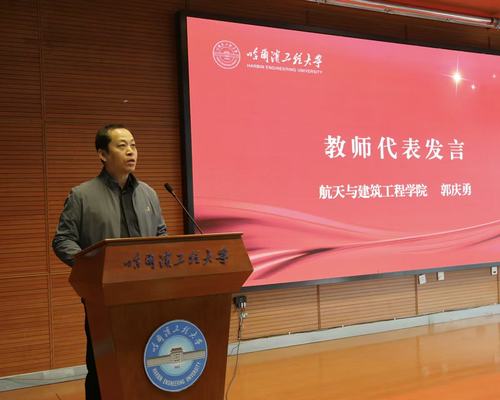 航天与建筑工程学院郭庆勇老师作为教师代表发言,寄语新生坚守初心、勤学善思、笃行致远,恪守学术诚信,携手共进。